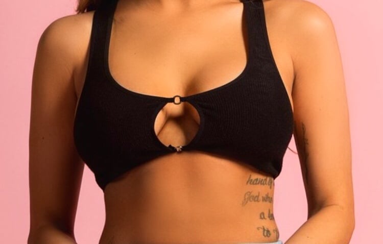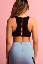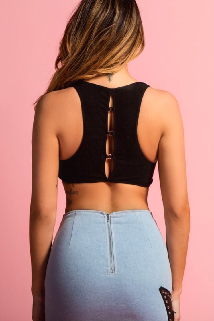 This crop tank is designed with a front cut out with ring hooks on the back. Cute and Edgy a must have in your closet.
